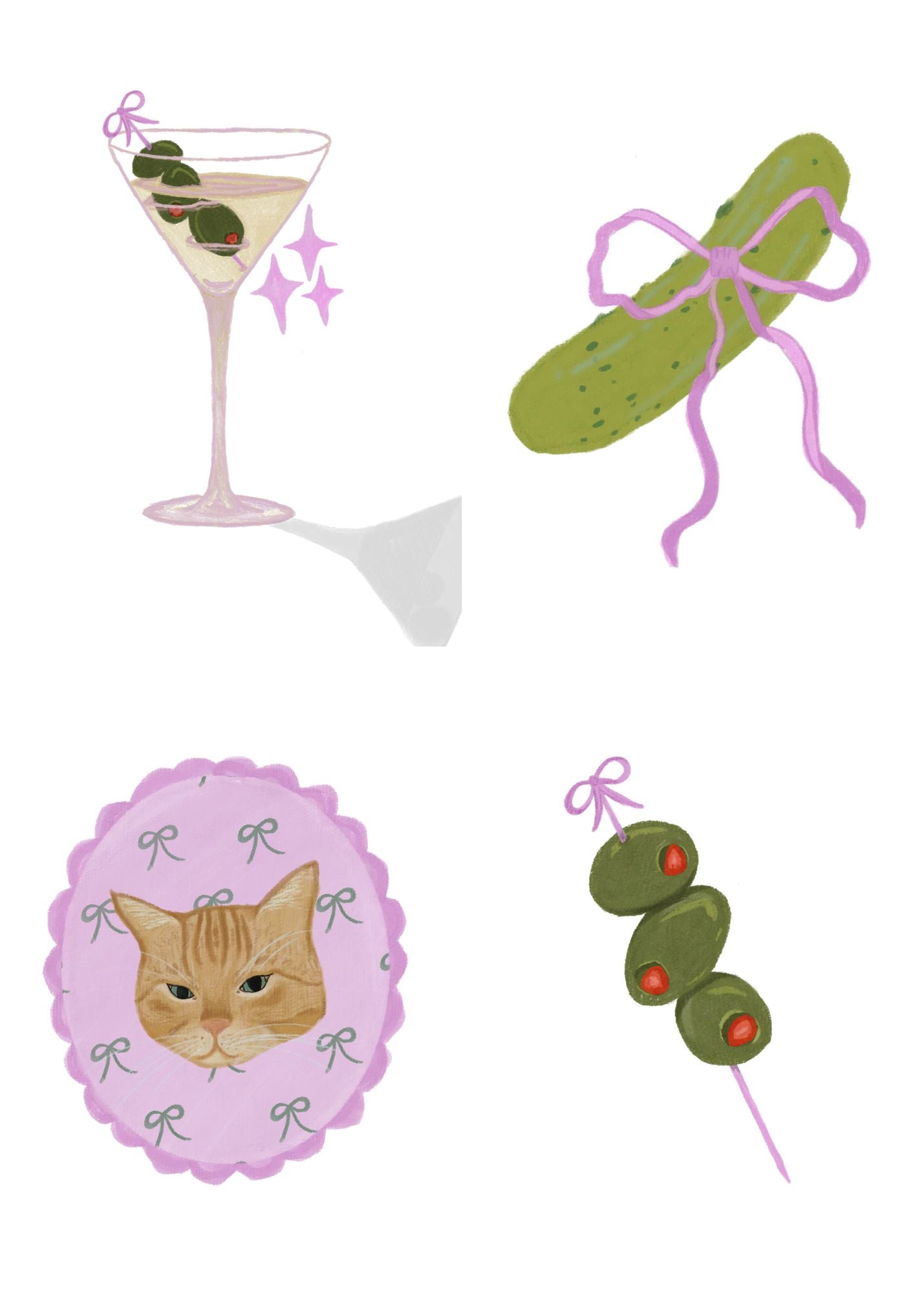 Five custom designed prints for a wedding. Wedding Colors: sage green, cream, powder blue. Signature Drinks: Dirty Shirley & Old Fashioned.